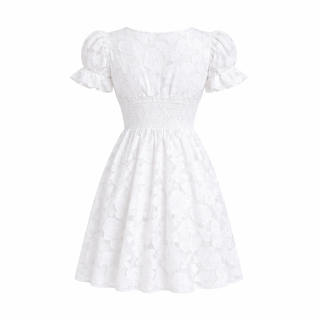 The short puff sleeves add subtle volume while enhancing the romantic silhouette.